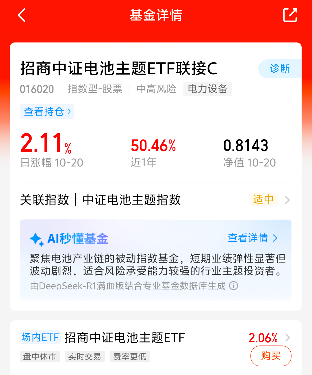 电池近期表现不错,昨天涨了2个点,今天继续大涨,中证电池指数盘中又涨了2个点,$招商中证电池主题ETF联接C(OTCFUND|016020)$近三个月涨了45.20%,近六个月涨了67.31%,业绩不错,近期调整的差不多了,开始反弹上涨,看好这个方向,我准备分批加仓了!