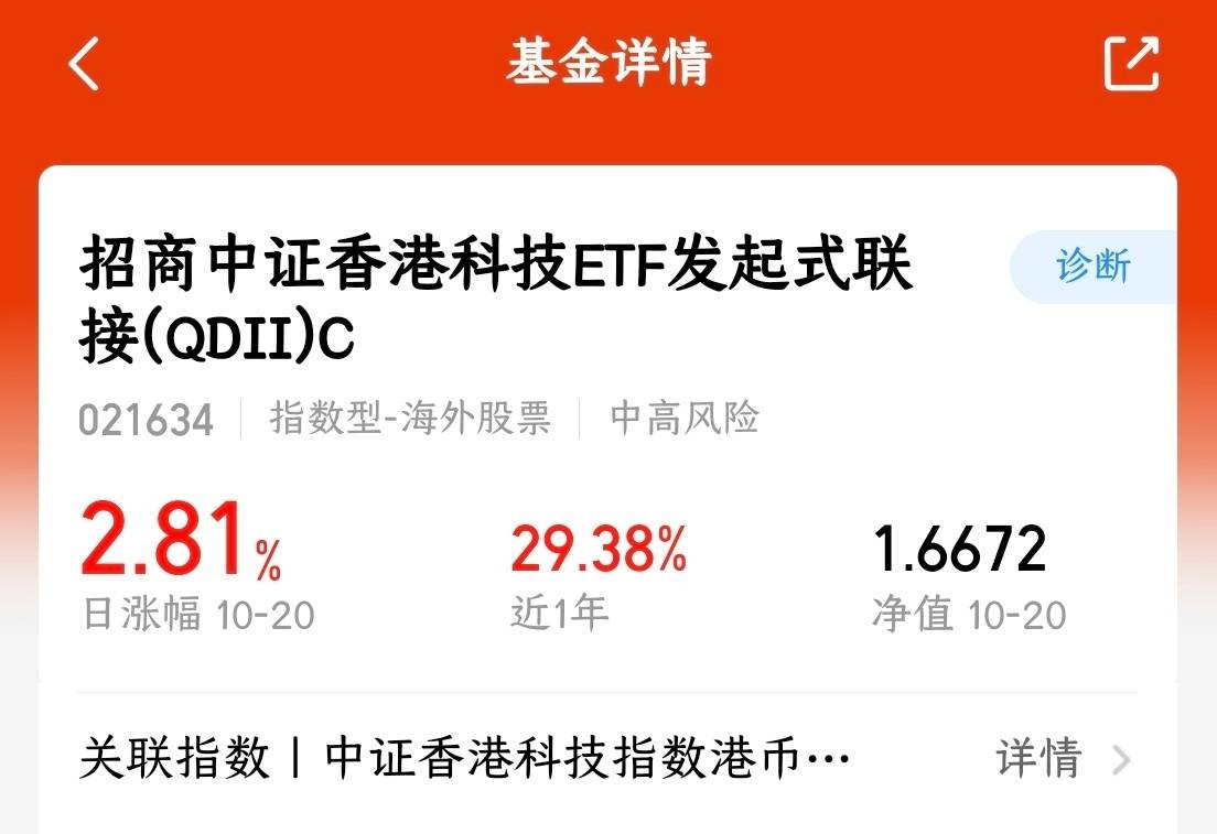 今天大盘继续高开高走,尤其港股涨幅领先。$招商中证香港科技ETF发起式联接(QDII)C(OTCFUND|021634)$昨日涨近3%,今日早盘又涨2%,表现耀眼。美联储降息后,美元升值空间受限,更多资金预计流入香港市场,推高优质资产价格。港股估值相对合理,投资性价比高。我打算分批布局,定投加仓,把握机会。总体来看,市场趋势向好,前景还是很不错的!