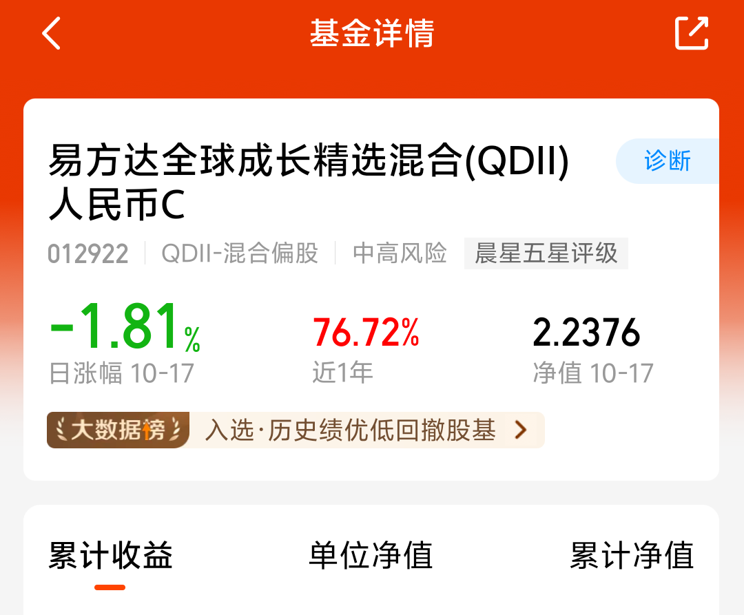 大A和港股今天整体涨了不少,大科技板块回暖上涨,美股昨夜也涨了不少,近期全球市场回暖,单一市场风险还是挺大的,我准备多元化投资,分散风险,易方达全球成长精选混合C持仓可投全球科技板块,美股、港股和A股都能投,近一年涨了76.72%,业绩不错,看好这个方向,我准备分批上车!