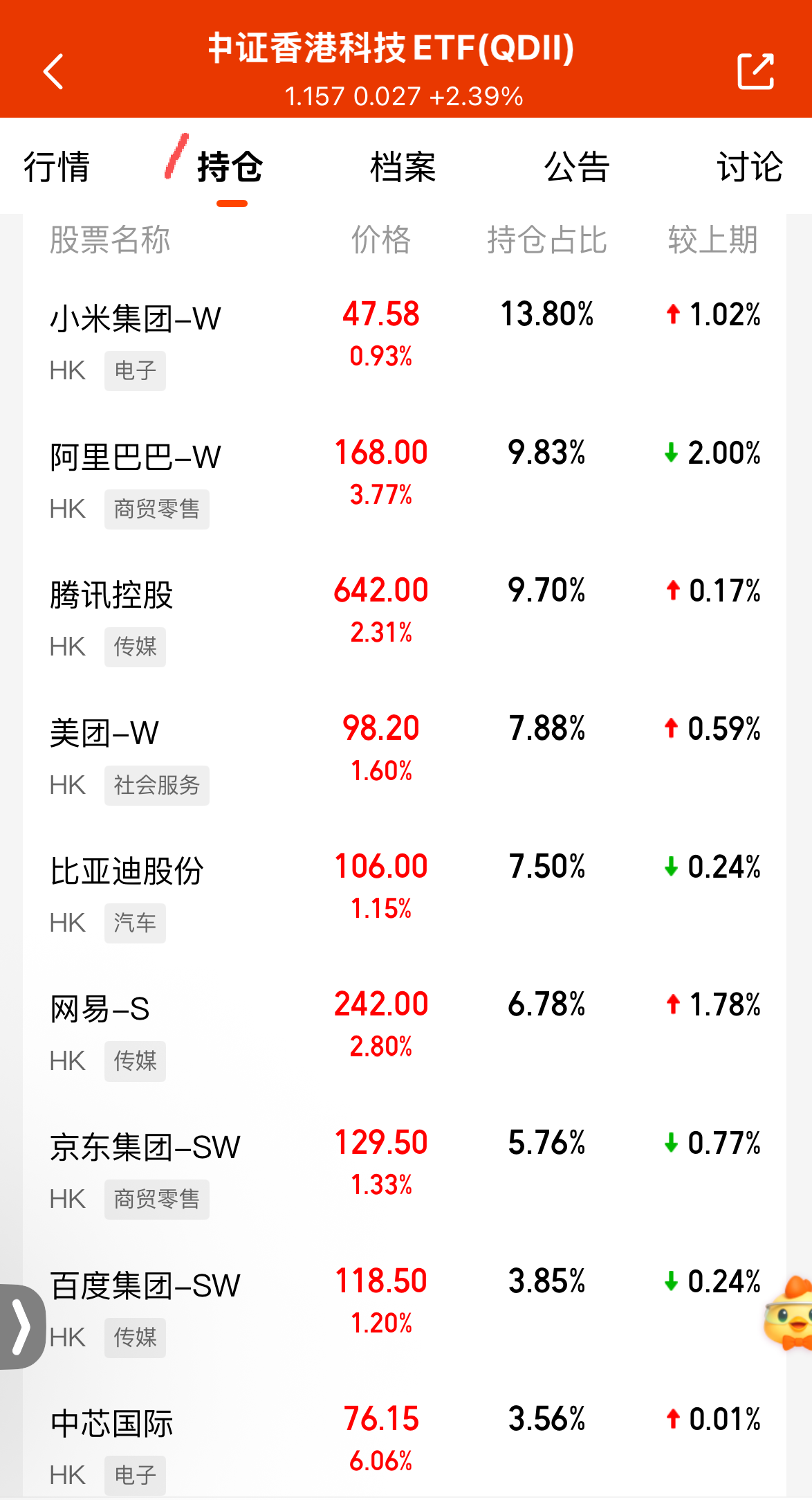红麻了宝子们,港股今天继续发力!跟我一样坚定持有的,今天继续大口吃肉!10月份调整过后,港股科技性价比凸显,同时南向资金持续加仓港股科技,叠加美联储降息催化,弹性空间显著,四季度我是继续看好。$招商中证香港科技ETF发起式联接(QDII)C(OTCFUND|021634)$跟踪的是中证香港科技指数,覆盖半导体、AI、新能源车等硬科技产业链,昨天收涨收涨2.81%,今天估值继续大涨,近一年29.38%,看好加仓!
