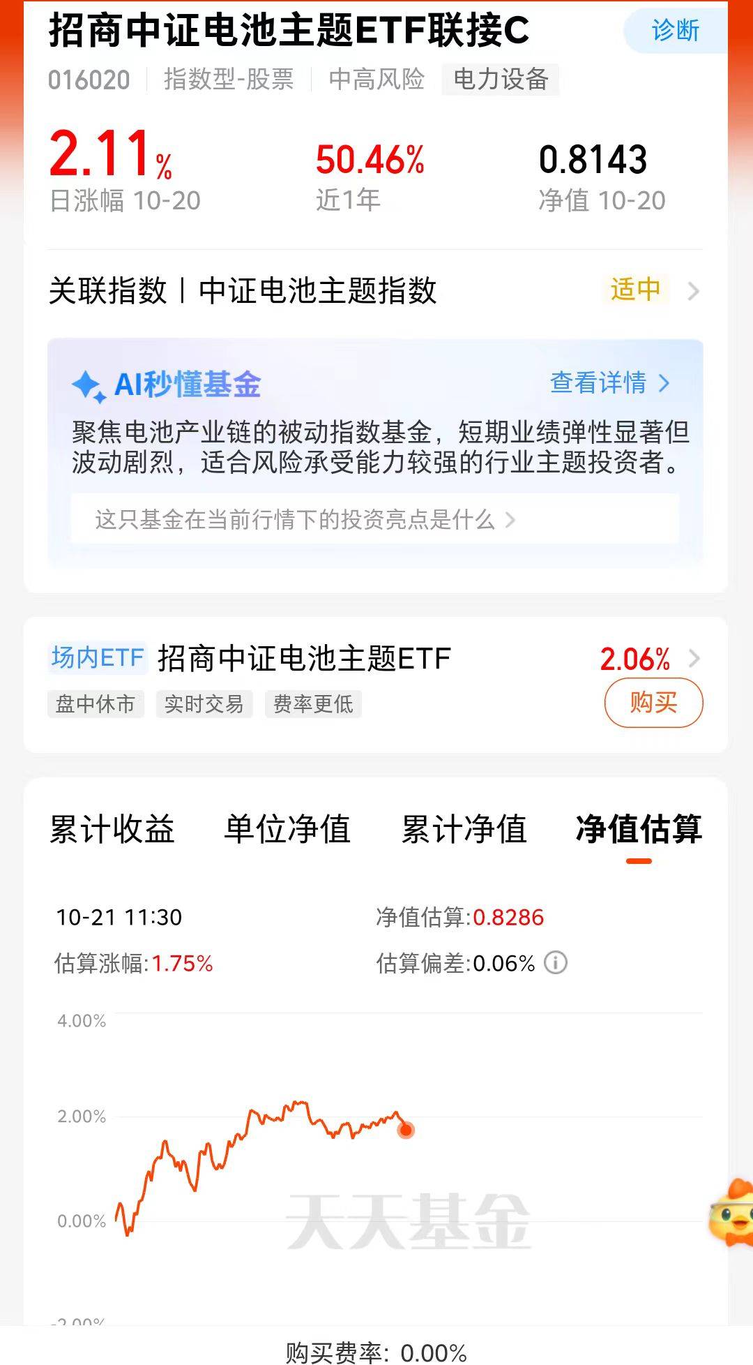 友友们,我就说电池板块就像第二个CPO呢,最近在技术突破和供需需求改变利好下,持续上涨呢。$招商中证电池主题ETF联接C(OTCFUND|016020)$昨天上涨2.11%,近三个月上涨45.2%,近半年上涨67.31%,业绩优秀,友友们也可以关注一下,适时就上车。