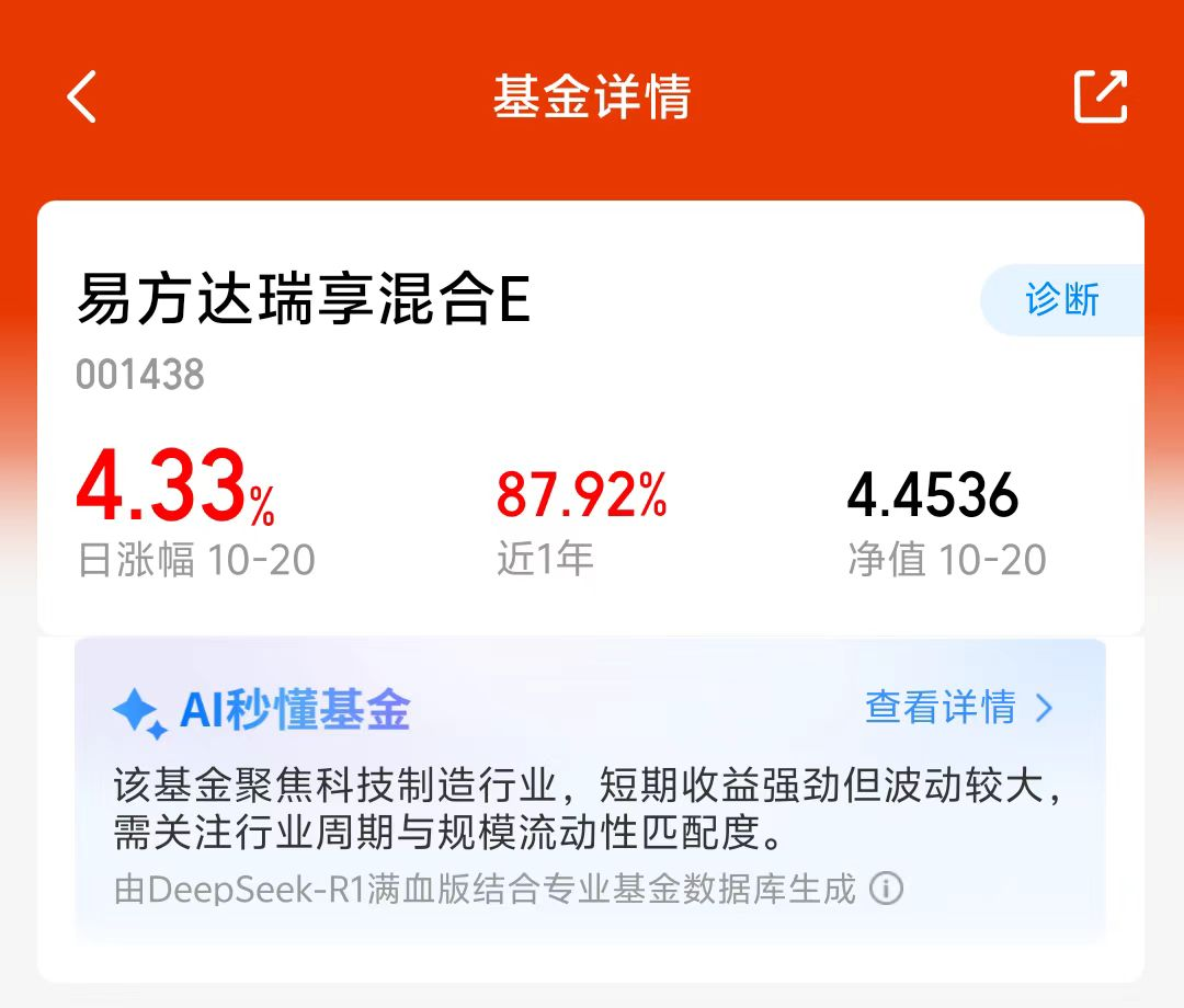 大盘今天继续上涨,科技板块表现不错,易方达瑞享混合E成立以来涨幅已经345.36%了,成长行情下爆发力很不错呢,经理个人能力比较强,调仓很坚定,效果也很不错,近期市场波动加剧,相信经理的全市场配置,最近CPO板块反弹,易方达瑞享混合E涨幅还不错,近三个月涨了26%,近六个月涨了114.92%,看好这个方向,我准备分批加仓!