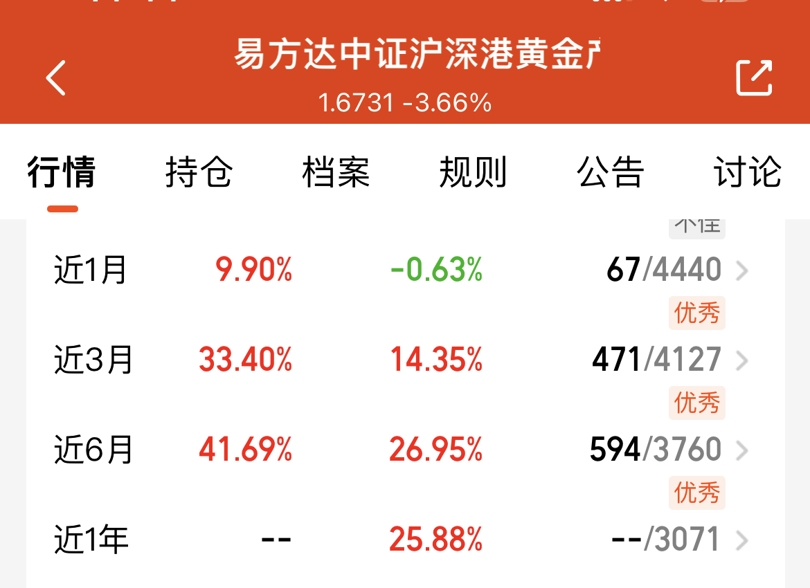 今日黄金赛道强势反弹,行情显然还没走完。黄金股本就是金价的“放大器”,涨势会跟着金价同步启动,我手里的$易方达中证沪深港黄金产业股票指数发起式C(OTCFUND|021363)$。这只基金近三月涨超33.40%,近半年涨幅41.69%,业绩甩开同类一大截。现在美联储降息周期开启,金价后续稳涨是大趋势,黄金股的弹性会更突出,我也继续补点仓位,既能跟住当下反弹,也能吃足金价上行的红利。