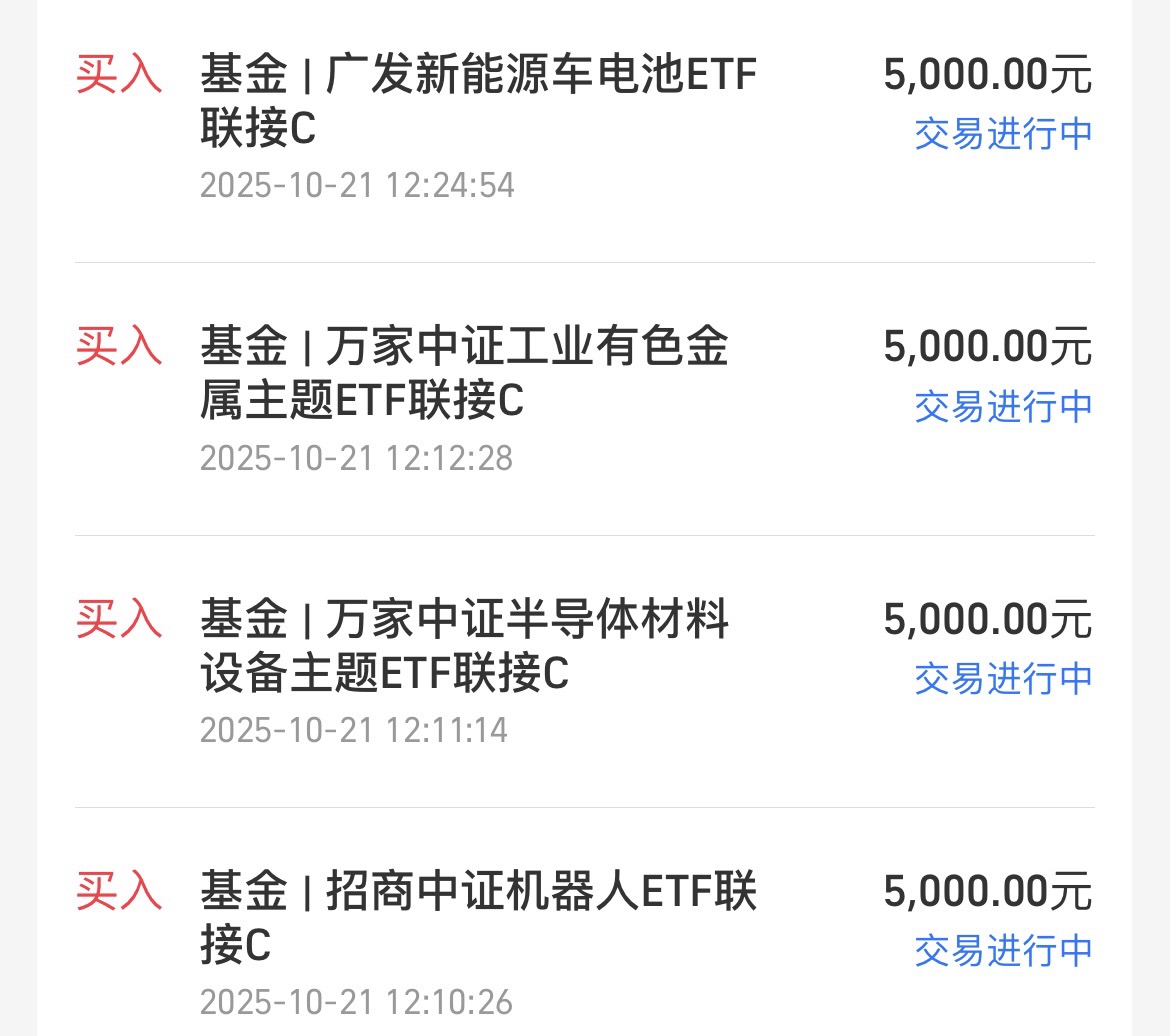 3. 有色金属,上车5000,$万家中证工业有色金属主题ETF发起式联接C$ 三天跌了接近5%,今天终于反弹了上涨1.8%,上一周有恐慌情绪,没有出手,今天止跌企稳我上车5000