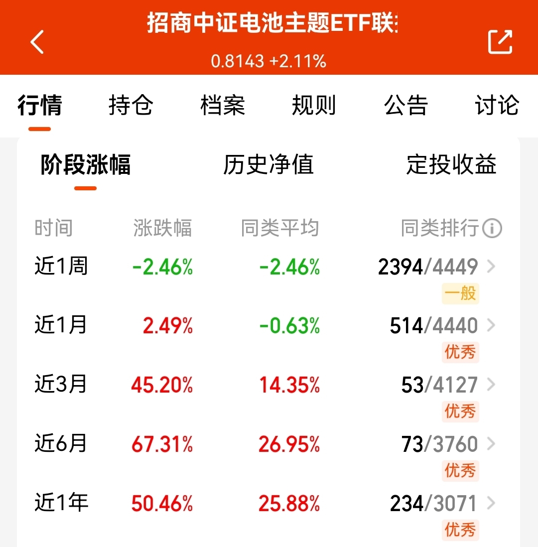 我还是继续看好这支$招商中证电池主题ETF联接C$ ,精准跟踪电池板块,近3个月还涨45.20%,今年半年收益也有67.31%,相对其他科技板块,收益也是全面领涨的;