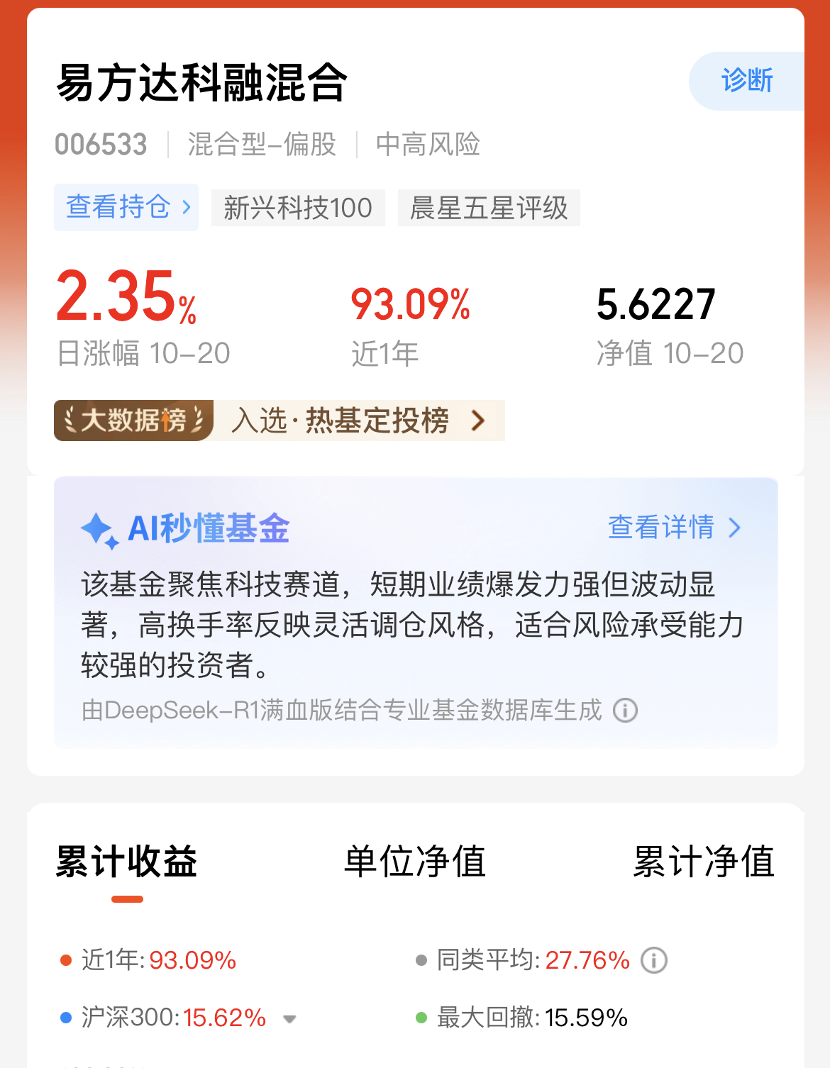 今日大科技行情全面爆发,我持有的$易方达科融混合(OTCFUND|006533)$也跟上节奏,昨天涨2.35%,今天估值再涨3.68%,涨势很猛。这只基金精准聚焦AI、算力赛道,重仓中际旭创、新易盛等核心标的,近3月涨超51%、近半年接近99%,业绩远超同类。它还兼顾A、H股科技资产,基金经理调仓灵活,回撤控制得也好。