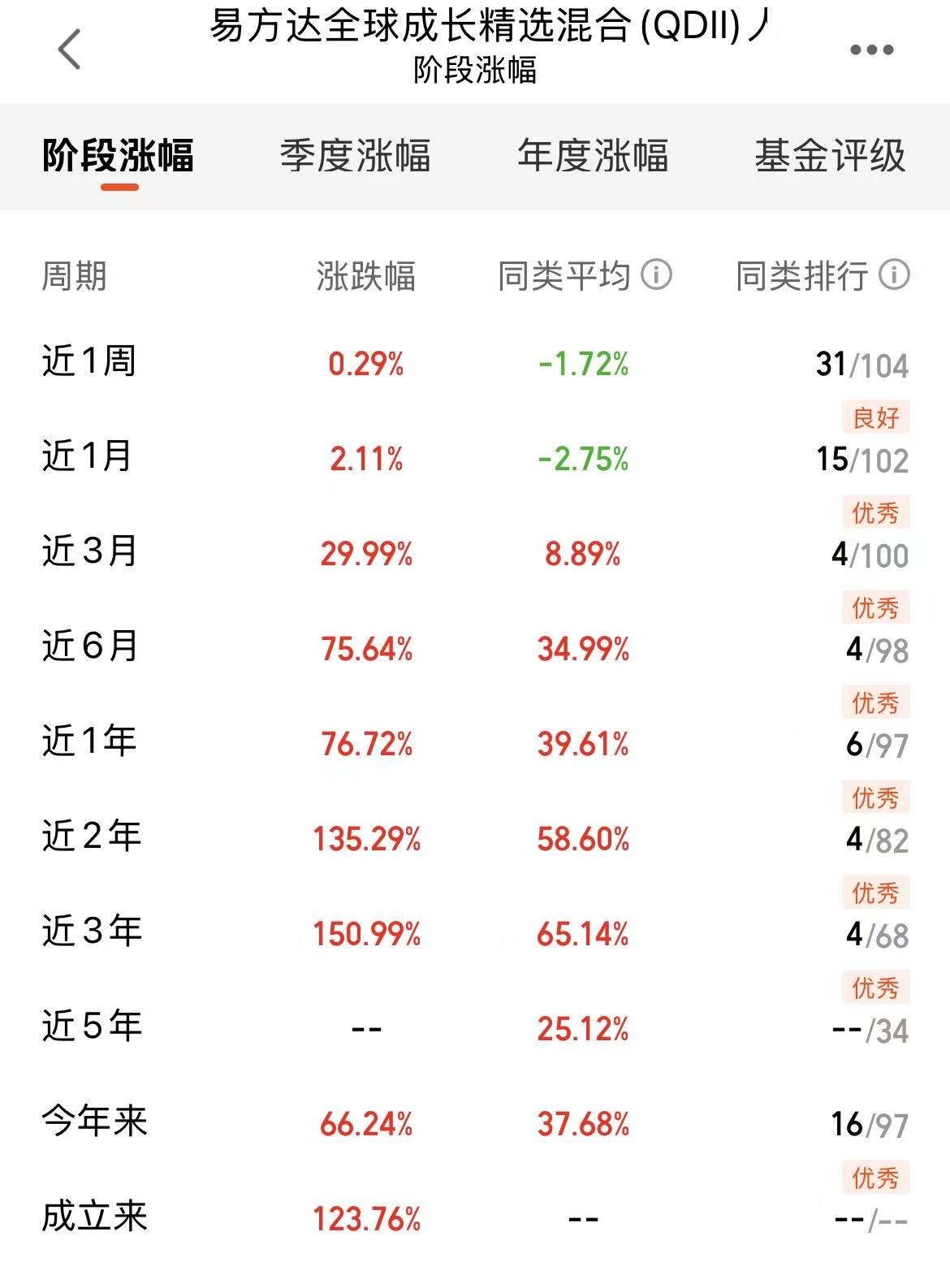 最近A股波动挺大的,美股这边屡破新高,黄金这边更是创历史新高了,所以我觉得持仓还是要多方位来,这样能更好的分散风险,$易方达全球成长精选混合(QDII)人民币C(OTCFUND|012922)$是布局多地市场的,不仅有美股,还有港股和A股,是科技方向为主的,近一年收益率76.72%,业绩出色,经理的择时能力也强,我觉得可以长期继续看涨的!