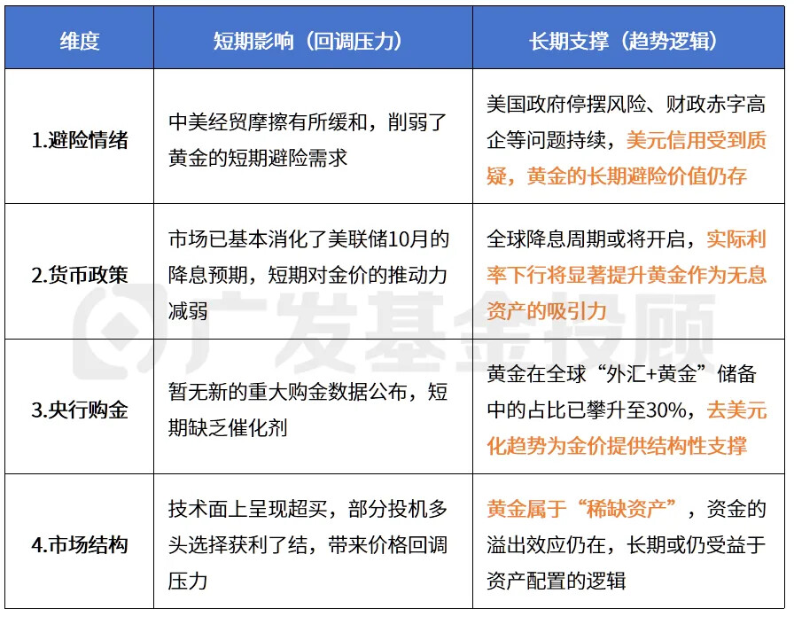 从中长期来看,全球债务越来越多、逆全球化还在继续,大家对美元的信赖度在下降,而黄金作为全球都认的“硬通货”,天然就是对冲这种信用风险的工具。再加上各国央行和黄金ETF还在持续买入,黄金的长期信心预计还是会慢慢往上走。