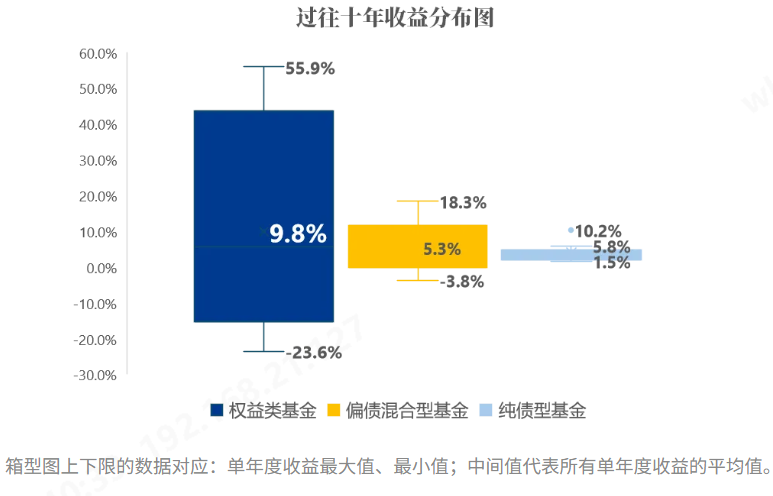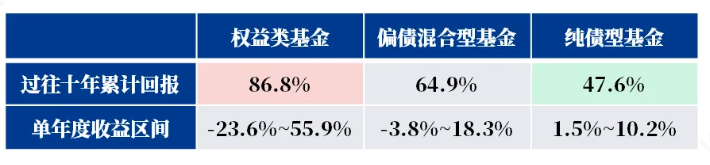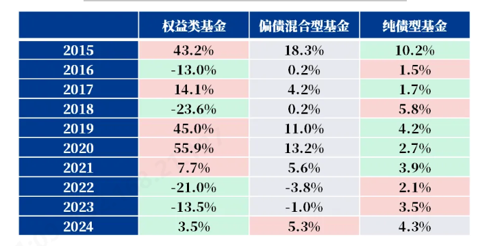 表格中“红色”为单年度“赢家”,“绿色”为单年度“输家”。过往10年数据区间:2015/1/1-2024/12/31。各类基金涨跌幅采用WIND对应指数:权益类基金885001.WI、偏债混合型基金885003.WI、纯债型基金885080.WI。历史不代表未来,投资须谨慎。