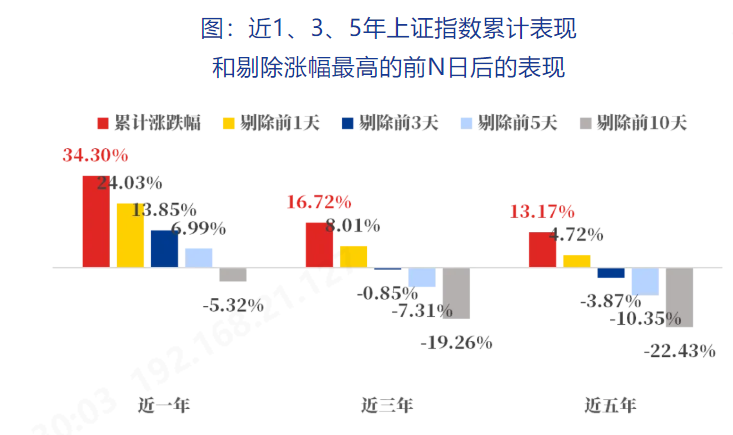 投资中或也存在“关键分”。拉取近1、3、5年上证指数表现,并计算剔除涨幅最高的1、3、5、10个交易日后的收益表现,可以发现如果错过“投资中的关键日”,收益会大打折扣——前1%的交易日贡献了超30%的收益。