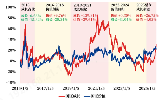 数据区间:2015/1/1-2025/9/26。使用国证价值指数(399371.SZ)代表价值风格,使用国证成长指数(399370.SZ)代表成长风格。上图区间分别选取:2015/1/1-2016/1/28,2016/1/29-2019/1/3,2019/1/4-2021/12/13,2021/12/14-2024/12/31,2025/1/1-2025/9/26。历史不代表未来,投资须谨慎。