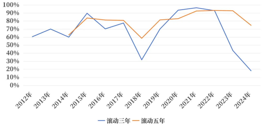 在此基础上,我们对主动权益三年、五年内对业绩比较基准的胜率做了进一步分析,从向前滚动三年和滚动五年的累计收益来看,相较单年度,主动权益基金跑赢基准的概率明显提升,三年维度来看,2012-2024年期间的绝大多数年份中,三年累计收益跑赢基准的主动权益基金数量占比超过60%,只有3年有40%以上的主动基金跑输基准。而从五年累计收益维度来看,则每年基本有60%以上的主动基金能够跑赢,不少年份可以达到80%-90%。