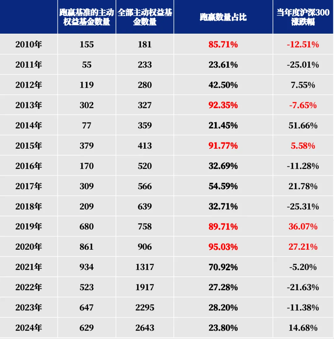 回看历史,我们发现过去三年对主动权益的种种声音言之有故。我们分析了自2010年开始主动权益基金战胜业绩比较基准的数量占比,图表显示,每个单年度,主动权益基金能否战胜业绩比较基准呈现周期效应,但2022年至2024年期间,相较业绩比较基准,主动权益胜率持续较低。