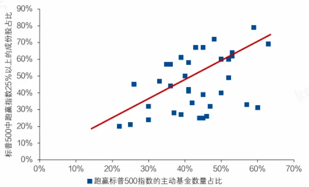 其次,根据Hartford Fund的研究,市场收益的“离散度”是决定主动管理能否取胜的关键。当市场中存在众多涨幅远超指数的股票时,主动基金可通过研究挖掘并重仓这些标的以获取超额收益;反之,若超额收益仅高度集中于极少数个股时,主动基金则难以甄别出能持续跑赢的标的,或因仓位限制无法充分分享其涨幅。