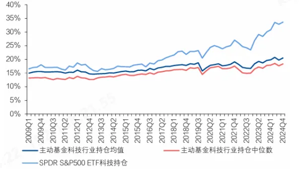 美国主动权益基金对于科技板块始终低配