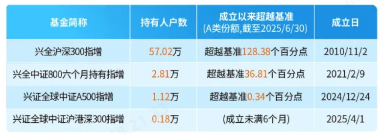 (持有人户数来源:2025年中报(兴全沪深300指增、兴全中证800六个月持有指增、兴证全球中证A500指增、兴证全球中证沪港深300指增),简单相加未去重,截至2025年6月30日。兴证全球中证沪港深300指增、兴证全球中证沪港深500指增成立不满半年,不予展示,详见文末风险提示。)