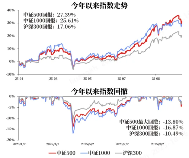 2025年以来,A股展现明显的结构性行情,科技成长、中小盘股相对强劲,进入三季度后震荡性有所加大。在此背景下,中证500指数具有成长属性、兼顾均衡的特点,其今年以来涨幅与中证1000指数相似,最大回撤比中证1000指数更小(如下图,截至2025/10/15),风险收益情况相对更具吸引力。