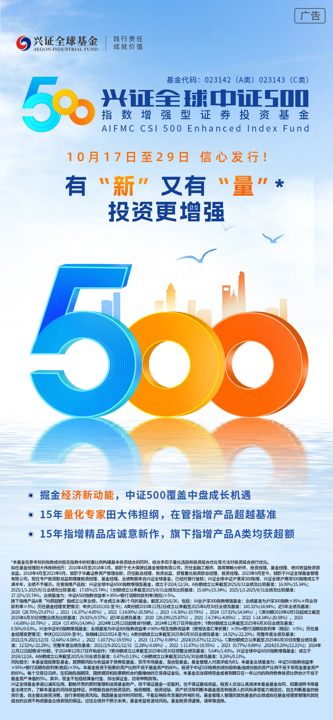 拟任基金经理田大伟投研经历:2010年4月至2018年3月,就职于光大保德信基金管理有限公司,历任金融工程师、首席策略分析师、投资经理、基金经理、绝对收益投资部总监。2018年4月至2023年9月,就职于华鑫证券资产管理总部,历任副总经理、投资总监、资管量化投资部总经理、投资经理。2023年9月至今,就职于兴证全球基金管理有限公司,现任专户投资部总监助理兼投资经理、基金经理。业绩数据来源:兴证全球基金,已经托管行复核;兴证全球中证沪港深300、兴证全球中证沪港深500成立不满半年,业绩不予展示;另外在管兴证全球红利量化选股基金,非指数增强型基金。具体投资策略详见基金合同。基金经理过往管理业绩是基金经理与所在公司投研、风控团队共同努力的结果,过往业绩不代表未来表现。兴证全球中证A500指数增强型基金成立于2024/12/24,A份额成立以来截至2025/8/31业绩及比较基准:16.00%/15.34%;2025/1/1-2025/8/31业绩及比较基准:17.65%15.74%;C份额成立以来截至2025/8/31业绩及比较基准:15.68%/15.34%; 2025/1/1-2025/8/31业绩及比较基准:17.32%/15.74%,业绩基准为:中证A500指数收益率95%+银行活期存款利率(税后)5%。指数增强经验:兴证全球基金首只指数增强型基金为兴全沪深300指数增强型基金,成立于2010年。10年维度股票投资能力数据来源:银河证券,截至2025/6/30。金牛奖信息来源:中国证券报,12座金牛基金管理公司大奖的颁奖年份:2008、2009、2010、2011、2012、2015、2016、2017、2018、2019、2020、2022。公司投研交人员数据来源:兴证全球基金及兴证全球资本管理(上海)有限公司,截至2025/6/30。持有人户数来源:2025年中报(兴全沪深300指增、兴全中证800六个月持有指增、兴证全球中证A500指增、兴证全球中证沪港深300指增),简单相加未去重,截至2025年6月30日。旗下指增产品A类成立以来均获超额:不含成立未满6个月的基金,截至2025/6/30,包括:兴全沪深300指数增强基金:业绩基准为沪深300指数95%+同业存款利率5%;历任基金经理变更情况:申庆(20101102-至今);A类份额2010年11月2日成立以来截至2025年6月30日业绩及基准:143.32%/14.94%;近5年业绩及基准:2020(28.70%/25.87%),2021(-6.37%/-4.85%),2022(-14.00%/-20.58%),2023(-6.30%/-10.79%),2024(17.92%/14.04%);C类份额2019年6月5日起成立截至2025年6月30日完整业绩及比较基准:29.92%/9.57%;近5年业绩及基准:2020(28.19%/25.87%),2021(-6.74%/-4.85%),2022(-14.34%/-20.58%),2023(-6.68%/-10.79%),2024(17.45%/14.04%);2024年12月12日起增设Y份额,2024年12月17日开始运作;Y类份额成立以来截至2025年6月30日业绩及基准:0.56%/0.63%。兴全中证800指数增强基金:业绩基准为中证800指数收益率90%+恒生指数收益率(使用估值汇率折算)5%+银行活期存款利率(税后)5%;历任基金经理变更情况:申庆(20210209-至今),张晓峰(20210524-至今);A类份额成立以来截至2025年6月30日业绩及基准:14.52%/-22.29%;完整年度业绩及基准:2021/2/9-2021/12/31(2.64%/-6.08%),2022(-10.71%/-19.55%),2023(1.17%/-9.89%),2024(15.67%/12.21%)。C类份额成立以来截至2025年6月30日完整业绩及基准:12.52%/-22.29%;完整年度业绩及基准:2021/2/9-2021/12/31(2.28%/-6.08%),2022(-11.07%/-19.55%),2023(0.77%/-9.89%),2024(15.20%/12.21%);2024年12月12日起增设Y份额,于2024年12月17日开始运作;Y类份额成立以来截至2025年6月30日完整业绩及基准:5.64%/1.43%。兴证全球中证A500指数增强基金:成立于2024/12/24,A份额成立以来截至2025/6/30业绩及基准:0.47%/0.13%;C份额成立以来截至2025/6/30业绩及基准:0.26%/0.13%。风险提示:本基金是股票型基金,其预期风险与收益高于债券型基金、货币市场基金、混合型基金。基金管理人对其评级为R3。本基金业绩基准为:中证500指数收益率95%+银行活期存款利率(税后)5%。本基金投资于股票的资产比例不低于基金资产的80%,投资于中证500指数的成份股和备选成份股的资产比例不低于非现金基金资产的80%。每个交易日日终,在扣除股指期货、国债期货和股票期权合约需缴纳的交易保证金后,本基金应当保持现金或者到期日在一年以内的政府债券投资比例合计不低于基金资产净值的5%,其中,现金不包括结算备付金、存出保证金、应收申购款等。兴证全球基金承诺以诚实信用、勤勉尽责的原则管理和运用基金财产,但不保证基金一定盈利,也不保证最低收益,投资人应当认真阅读本基金基金合同、招募说明书等基金法律文件,了解本基金的风险收益特征,并根据自身的投资目的、投资期限、投资经验、资产状况等判断本基金是否和投资人的风险承受能力相适应,自主判断基金的投资价值,自主做出投资决策,自行承担投资风险。我国基金运作时间较短,不能反映股市发展的所有阶段。基金管理人管理的其他基金的业绩或拟任基金经理曾管理的其他组合的业绩不构成基金业绩表现的保证。过往业绩并不预示未来,基金收益有波动风险。基金投资须谨慎,请审慎选择。