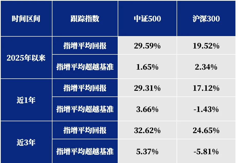 中证500是市场上重要的宽基指数,在数量、规模方面,中证500指增都是仅次于沪深300指增的指数增强基金品类。数据显示,过去一年有78%的中证500指增基金获得正超额收益,今年以来、近1年、近3年平均回报、平均超额收益表现较为优秀(如下表,截至2025年9月30日),超额收益情况更体现主动管理能力整体水平。