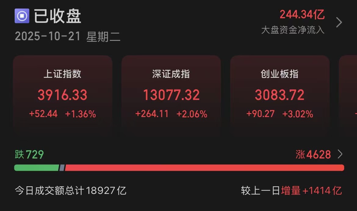 10月21日,A股三大指数齐涨,市场走势体现了基本面韧性、政策面支撑与资金面改善的三重驱动。科技成长板块的强势表现与宏观经济结构优化趋势相呼应,政策利好与产业热点形成共振,推动市场风险偏好回升。港股市场同样表现积极但稍显震荡,盘中冲高回落,午后涨幅明显收窄,科网股全线飘红,权重股涨幅居前。