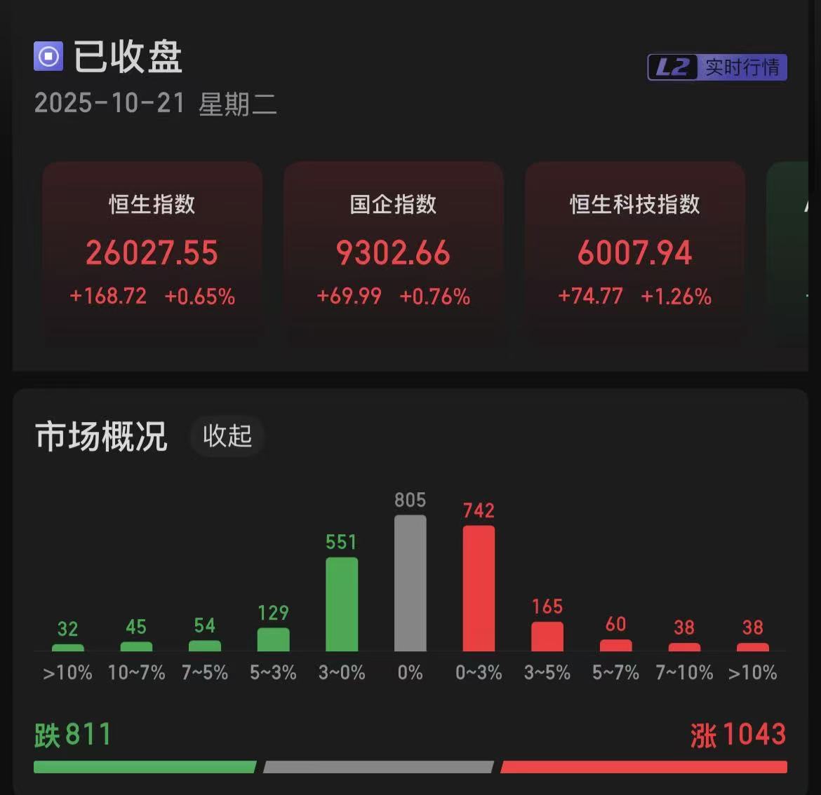 恒生指数上涨0.65%,国企指数上涨0.76%,恒生科技指数上涨1.26%。1043只个股上涨,811只个股下跌。南向资金,净买入11.71亿港元。