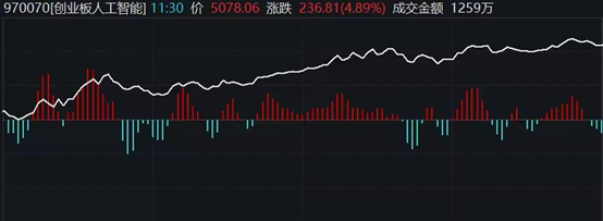 10月21日,早盘A股市场震荡上行,创业板大涨超2%领涨,人工智能板块上涨。截至11时30分,创业板人工智能指数上涨4.89%。