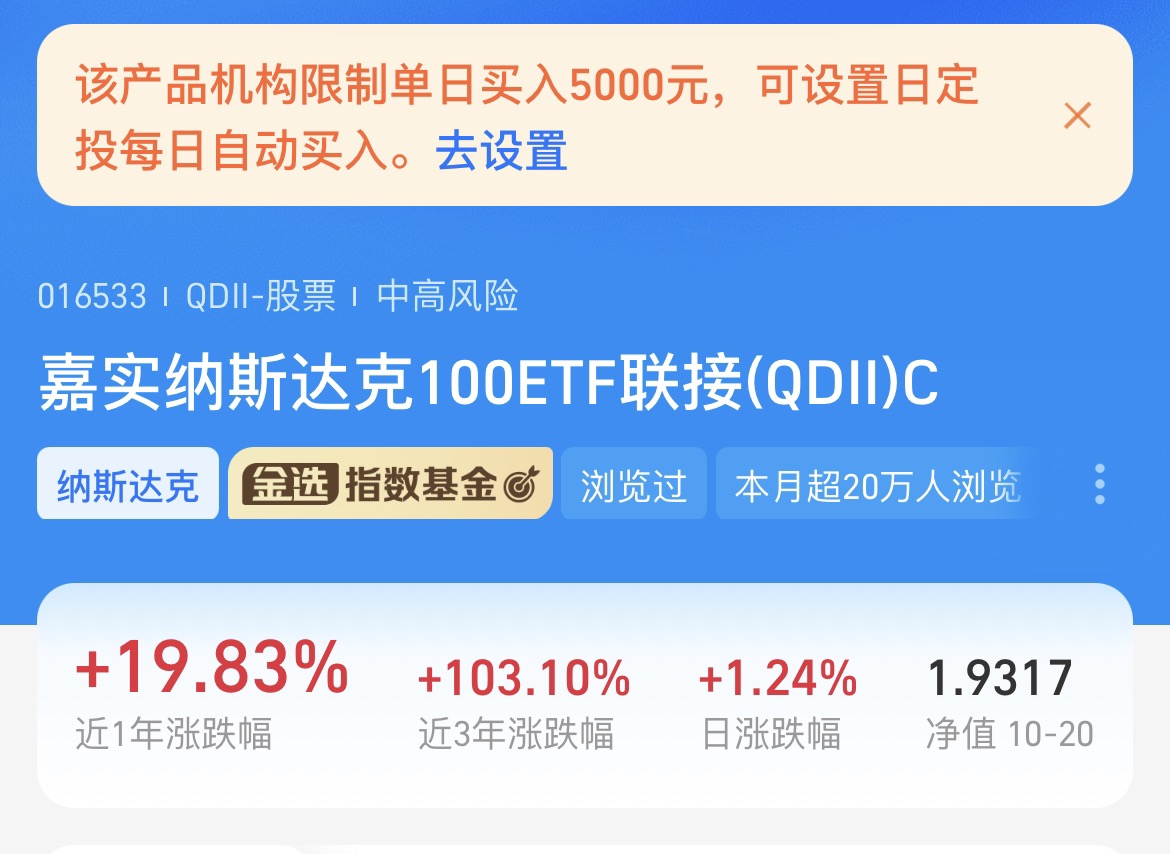 九月美联储降息落地,预期月底会再次降息,在AI产业浪潮下,纳斯达克100指数刷新了历史新高,虽然短期内有所波动,但是整体仍保持了一定的涨幅,纳斯达克100近三年来利润实现高增长。我一直关注的$嘉实纳斯达克100ETF发起联接(QDII)C人民币$ 单日限额5000元,业绩收益波动较低。一键布局了美股上市的科技龙头企业,重仓股英伟达、苹果、亚马逊、微软等等,都是流动性较高的优质企业。该基金自身业绩稳定,再加上行业高成长性、高弹性,我认为未来依旧是科技的主流,继续关注了