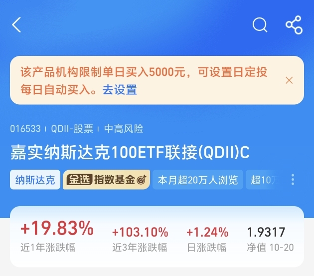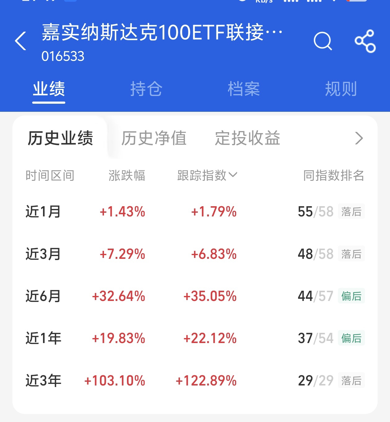 $嘉实纳斯达克100ETF发起联接(QDII)C人民币$ 基金历史业绩也是非常的优秀,今天晚上单上涨了1.24%,近六个月上涨了32.64%,盈利能力强。各阶段业绩在同类基金排名领先,收益率远超同类平均。基金精准的跟踪纳斯达克100指数,综合费率低。并且基金当日限购5000元,额度也比较大,适合定投并长期持有。纳斯达克100指数在AI浪潮的驱动下,将迎来新一轮的上涨。长期持有投资回报率高,期待后期收益。