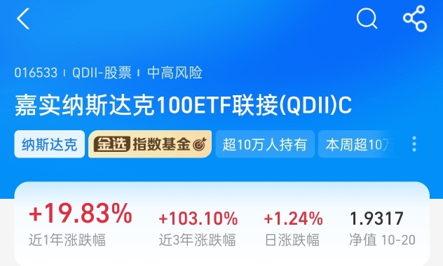 $嘉实纳斯达克100ETF联接(QDII)C$ 核心优势在于能紧密贴合纳斯达克100指数的走势,有效跟踪指数表现,持仓包含了微软、苹果、英伟达等在全球范围内具有强劲竞争力的科技龙头企业,是投资者参与美股市场、配置核心资产的优质全球化工具。还是很不错呢,加油!