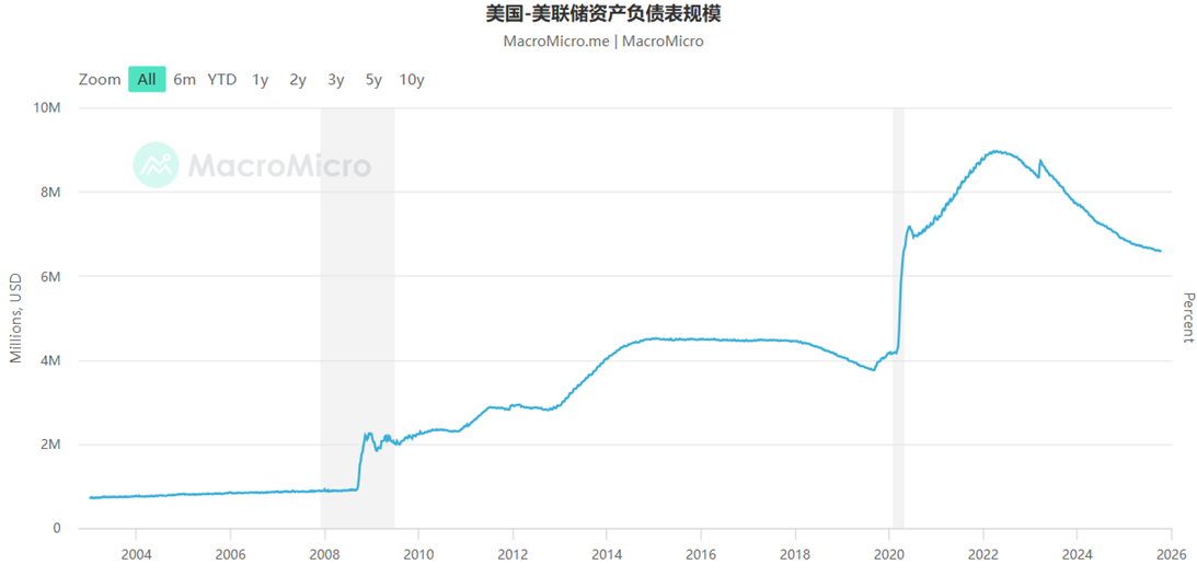 美联储总资产已从峰值近9万亿美元降至6.3万亿美元,银行体系准备金也降至约3万亿美元。