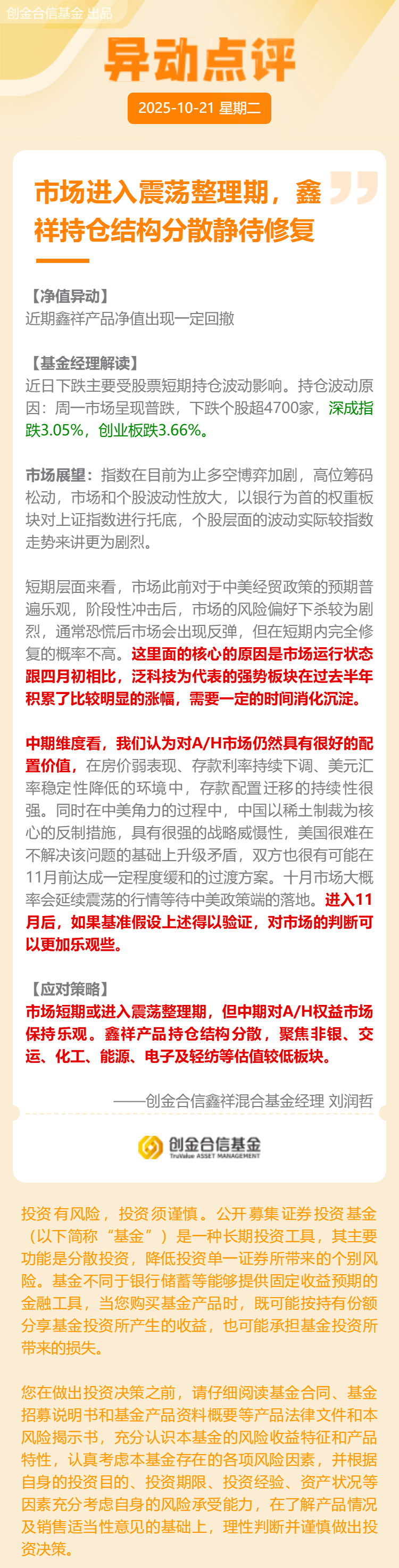 市场短期或进入震荡整理期,但中期对A/H权益市场保持乐观。$创金合信鑫祥混合C(OTCFUND|010606)$ 持仓结构分散,聚焦非银、交运、化工、能源、电子及轻纺等估值较低板块。