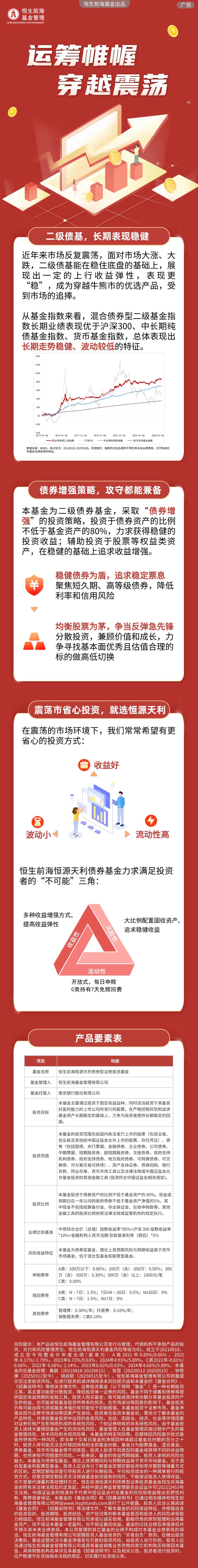 在权益市场波动加大的当下,与其在股市的涨跌中焦虑,不如选择一只“进可攻、退可守”的二级债基。如果您也不想经历过山车般的颠簸,又担心错过股市行情,不妨多多关注恒生前海恒源天利债券A(013204),作为股债搭配、攻守兼备的二级债基,助您从容应对市场变化!