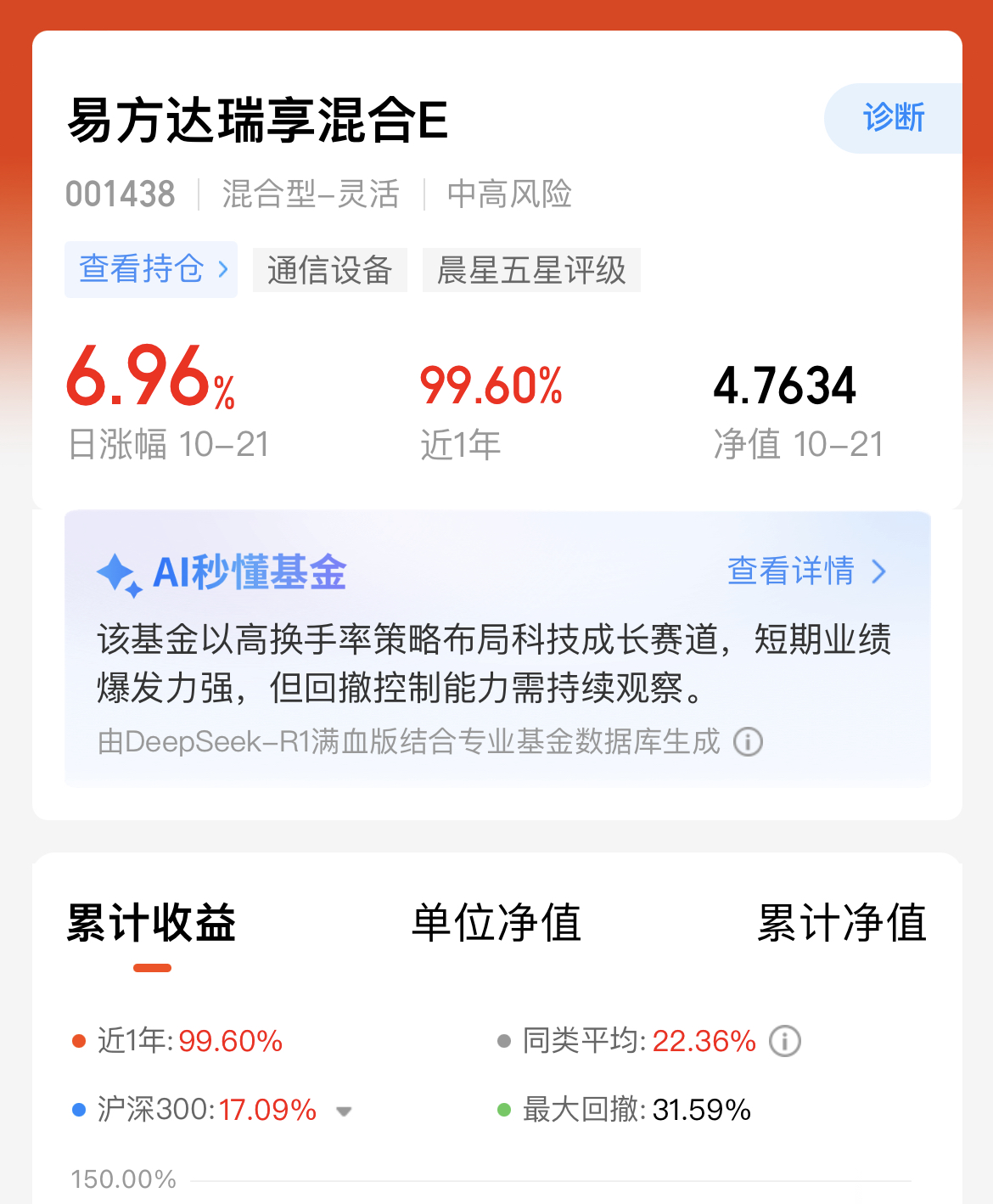 科技行情起来后,不少基金表现分化,而$易方达瑞享混合E(OTCFUND|001438)$各阶段都很能打。昨天涨了6.96%,近三个月35.92%,近半年直接超123%,短期和中长期收益都很稳。基金经理武阳经验足,之前选的赛道和调仓都挺成功,这只基金不管是趁现在抓反弹,还是长期持有,都挺合适的,我也继续拿稳啦!