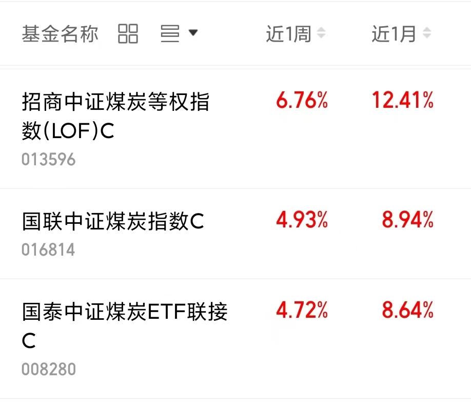 $招商中证煤炭等权指数(LOF)C(OTCFUND|013596)$近1周收涨6.76%。