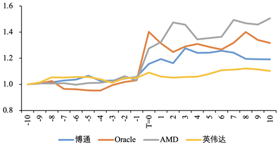 注:T=0日为该公司与OpenAI合作/订单的公布日,股价复权后归一到T-10日