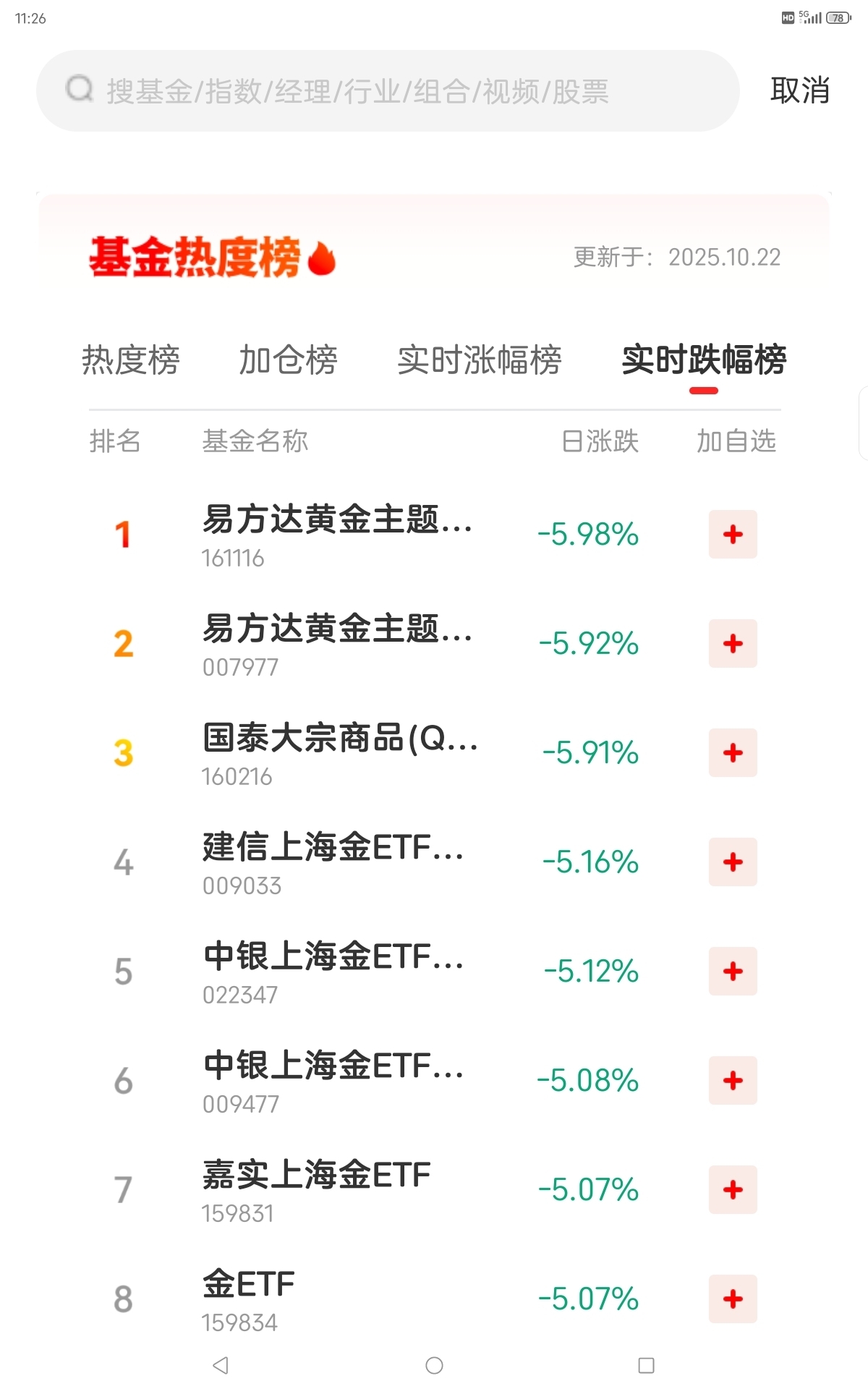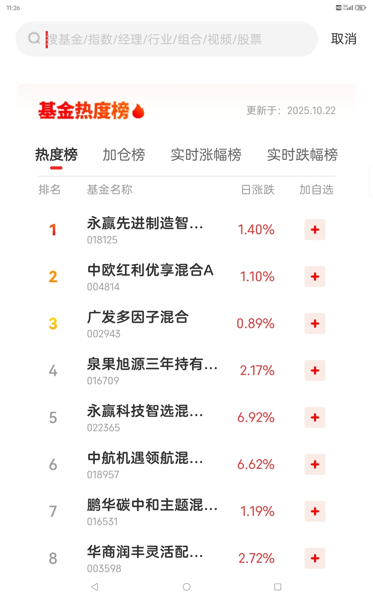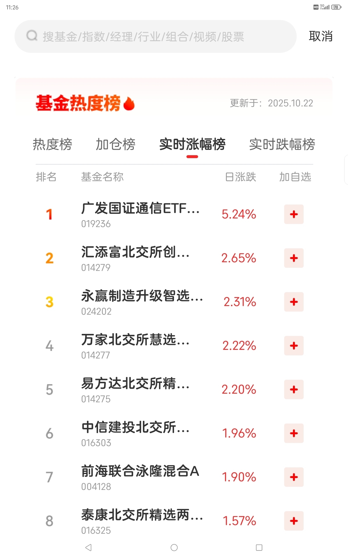 10月22日基金热度榜,加仓榜,实时涨跌幅榜。 通信,黄金