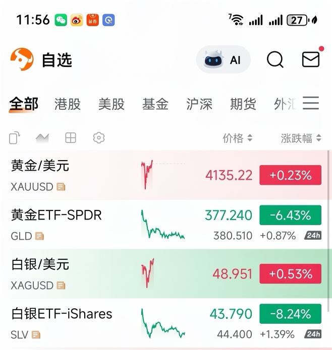 在今天上午11点56分,目前观察现货黄金在后来已经陆续拉升翻红变涨+0.23%了。与在目前,观察现货白银,也是在后来陆续拉升翻红变涨+0.53%了。与