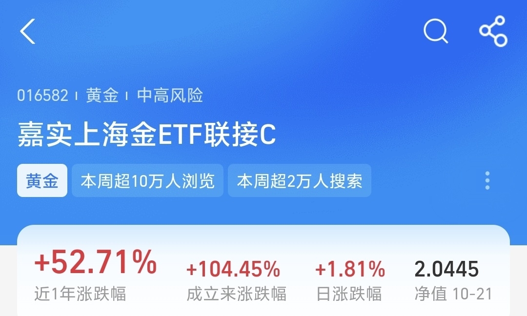 黄金就跟着调整了。不过虽说今天黄金跌回4000美元,但长远来看,它又能避险、又能当美元的替代品,还能对冲风险,这几重作用摆在那儿,我肯定得攥着黄金不放。 其中我的$嘉实上海金ETF发起联接C$ 昨天涨了1.81%,近一年更是涨了52.71%,在同类型基金里表现突出,现在黄金调整,我觉得是好机会,我打算加点儿。 $博时黄金ETF联接C$ 上涨1.32%,可以 $华安黄金易ETF联接C$ 上涨1.30%,也可以。