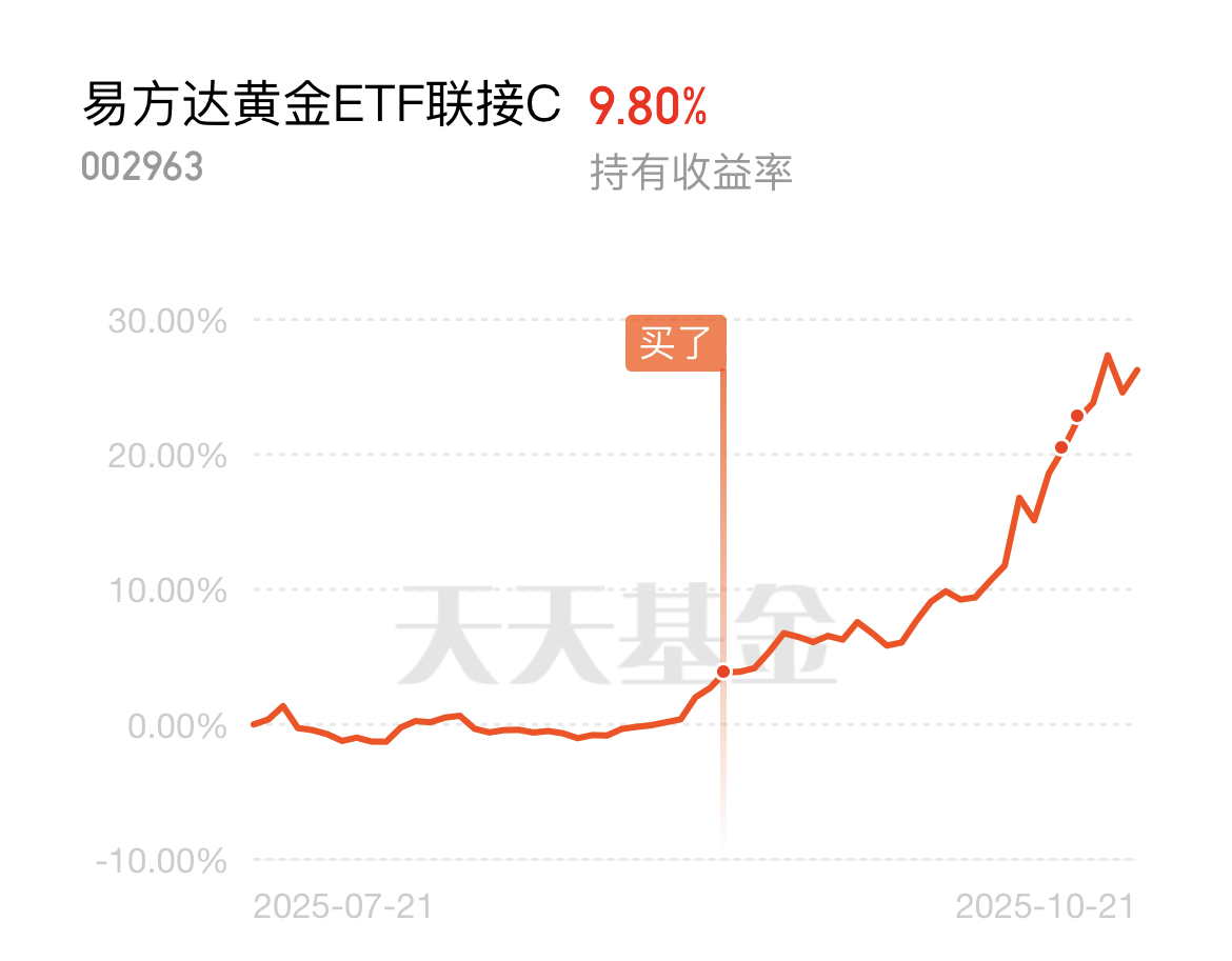 今天黄金有所调整,但这只是短期扰动,长期逻辑没破。央行还在持续购金,抗通胀、避险的核心属性都撑着金价。趁着调整我今天补仓了$易方达黄金ETF联接C(OTCFUND|002963)$,这只基近一年涨了54.81%,跟踪金价也准。短期调整正好是分批布局的机会,我打算分批加仓,跟着长期趋势走,耐心等待反弹行情。