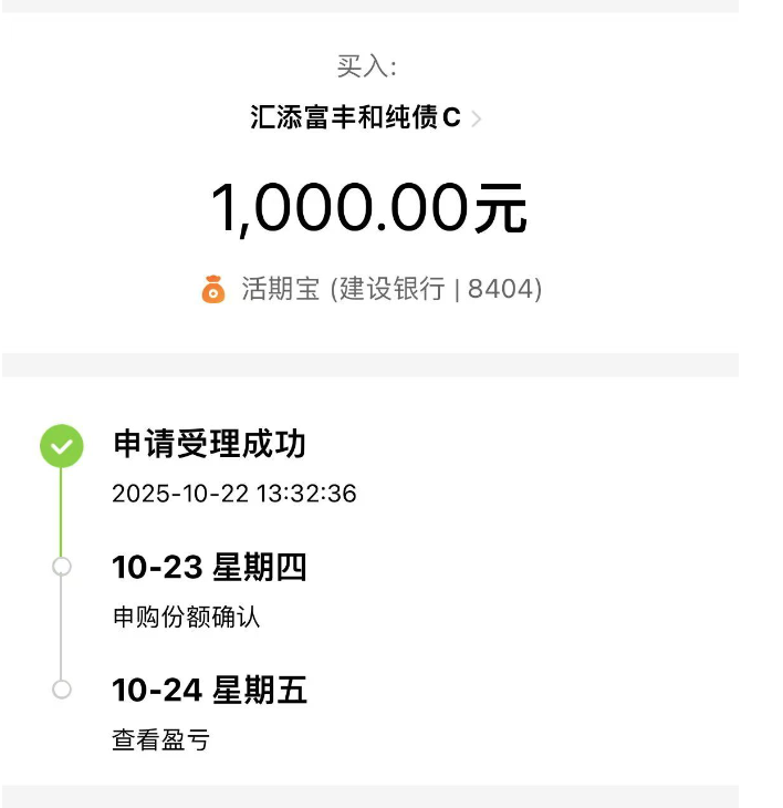 $汇添富丰和纯债C(OTCFUND|017460)$+1000,最近股市波动大,板块轮动快,很难把握住行情,我发现债市反相对稳一些了,尤其超长期品种悄悄反弹。手头持有的汇添富丰和债基,我打算重新布局——之前留了底仓但没大动,现在正好趁回调摊低成本。这只基金核心久期30年,跟30年国债走势同步,没什么折价损耗,性价比高,趁股市震荡把握时机布局丰和,股市对冲的比较好,最近一周它反弹挺多了,关键满7天免赎回费,进出灵活。查了下,四季度债市通常表现不错,现在入场时机好。债市冷清太久,慢慢买能攒收益,还能和股票对冲风险。今天先加1000元,后续再慢慢提升债基仓位,让组合更稳当些