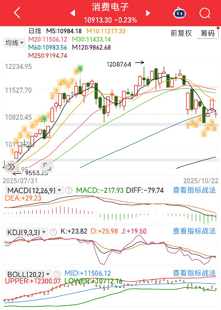 看消费电子指数,短期确实有些疲软,5日10日均线往下走,MACD还在零轴下方。但KDJ已经接近超卖区,技术面有反弹需求。不过我建议别急着一把梭哈,得等反弹放量突破20日线再确认趋势。