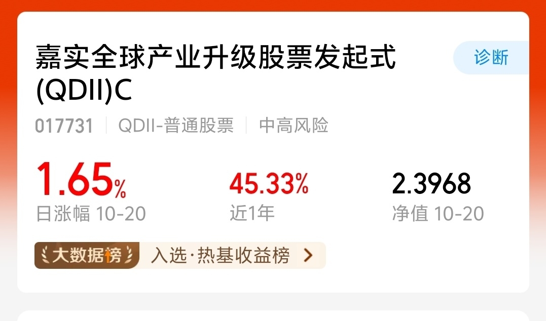 市场热点集中于科技产业升级领域,AI与半导体板块受机构持续关注。嘉实全球产业升级股票(QDII)C 昨日涨1.65%,近三月涨26.89%。作为QDII基金,它帮投资者规避换汇麻烦,聚焦全球高潜力赛道,历史业绩显示其能显著跑赢同类平均水平 。