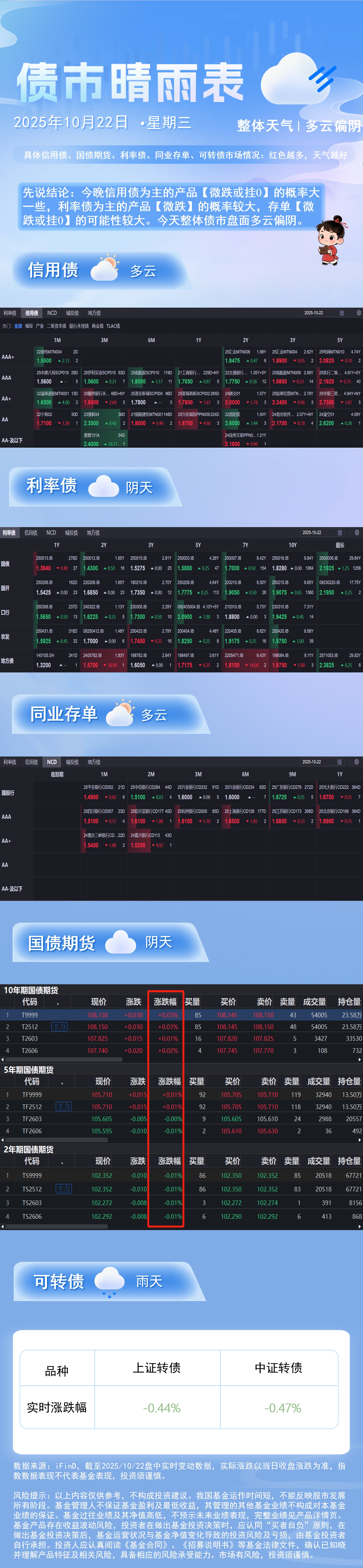 先说结论:今晚信用债为主的产品【微跌或挂0】的概率大一些,利率债为主的产品【微跌】的概率较大,存单【微跌或挂0】的可能性较大。今天整体债市盘面多云偏阴