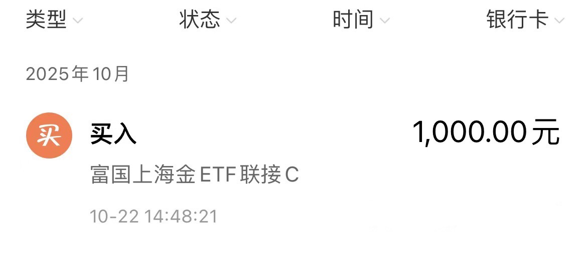 操作上,趁着大幅下跌的机会,今天我上1000,通过ETF的形式跟踪国际金价