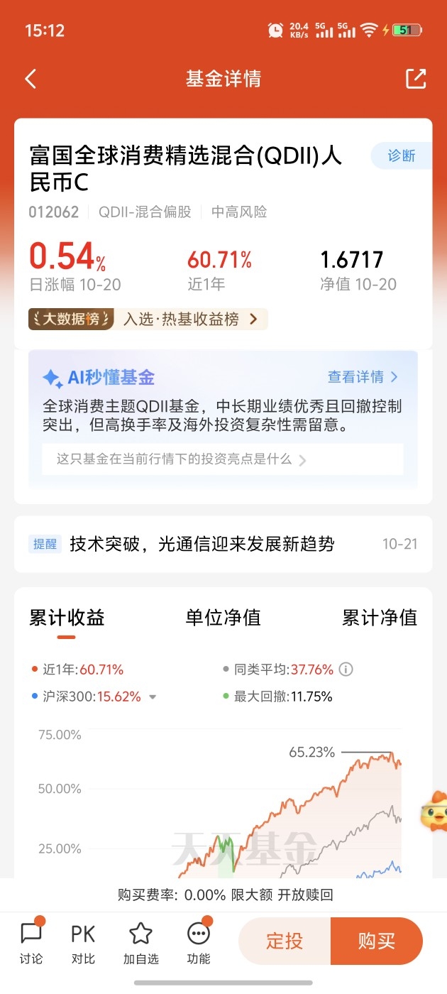 最近黄金是下跌了,没法再入手了,不过可以考虑$富国全球消费精选混合(QDII)人