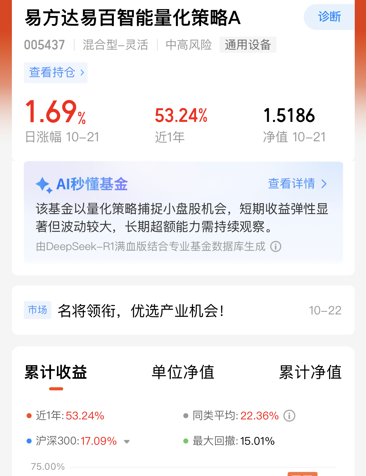 我手里的$易方达易百智能量化策略A(OTCFUND|005437)$的优势就很突出了。它靠优质量化策略长期跑赢市场,近半年涨幅33.97%、近一年涨幅53.24%,业绩很亮眼。而且牛市里它能高频调仓,灵活应对板块轮动,既能放大收益,又能避免踏空,不用纠结追哪个赛道,在震荡向上的行情中,还是不错的,继续拿稳啦!