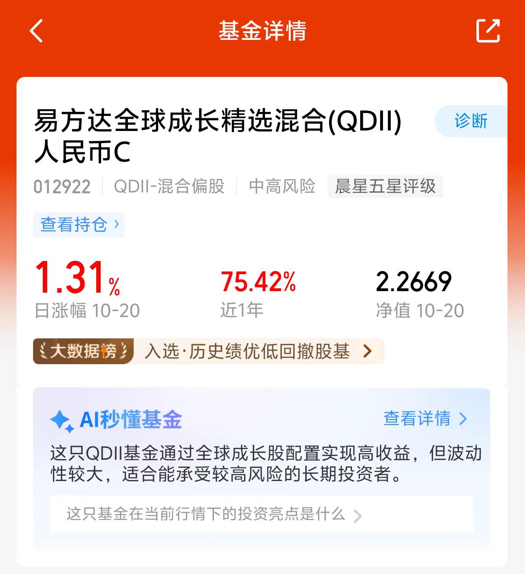 美股昨夜小幅回调,大A今天也调整了,近期市场波动还是挺大的,单一市场风险比较大,易方达全球成长精选混合C持仓可投全球科技板块,美股、港股和A股都能投,灵活把握多个市场科技成长机遇,近一年涨了75.42%,业绩不错,看好这个方向,我准备分批加仓!