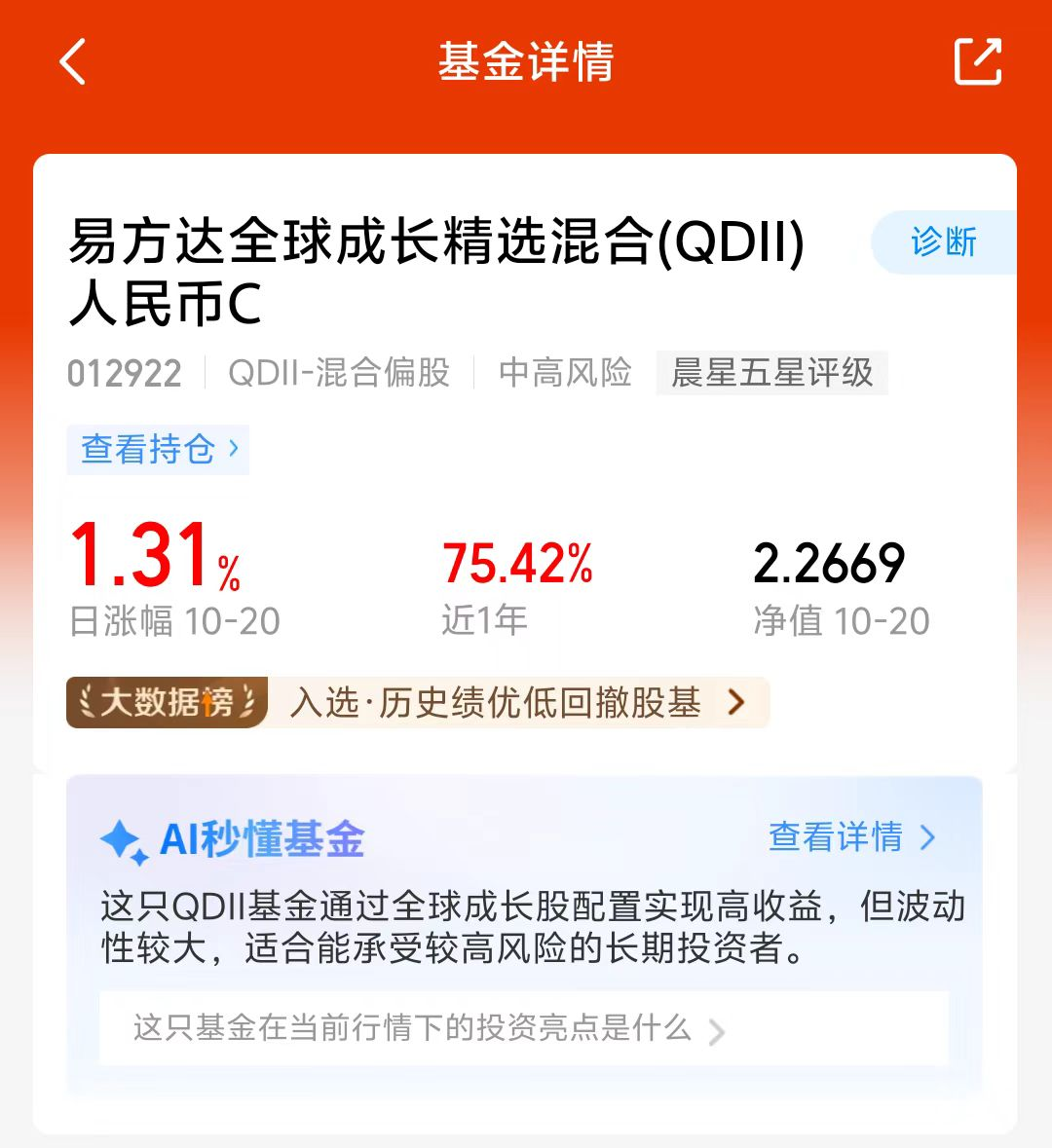 美股小幅回调,港股和A股今天也调整了,近期市场波动比较大,轮动速度很快,单一市场风险比较大,我准备多元化投资,易方达全球成长精选混合C持仓可投全球科技板块,美股、港股和A股都能投,近一年涨了75.42%,还是历史绩优低回撤榜一,能涨抗跌,经理调仓能力不错,我准备分批加仓了!
