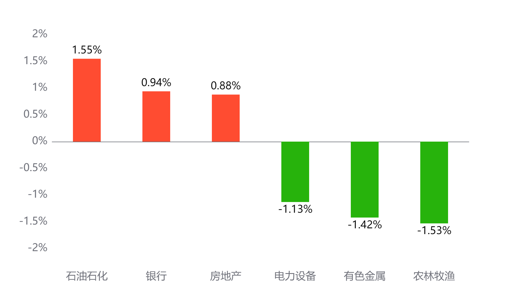 今天表现最好的行业板块依次为石油石化、银行、房地产,表现最差的依次为电力设备、有色金属、农林牧渔。