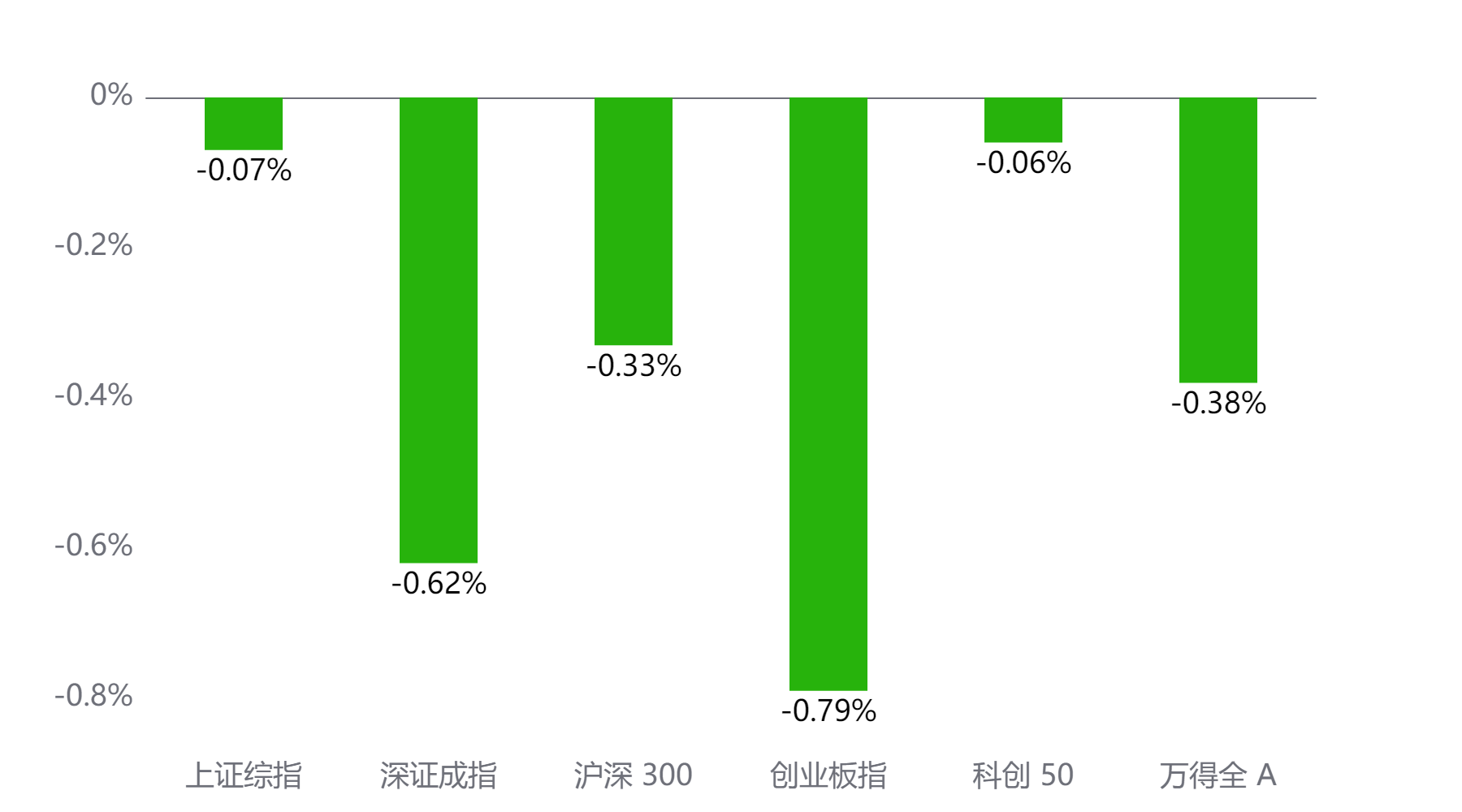 截至今日收盘,市场各主要指数普遍下跌。上证综指收3913.76点,下跌0.07%;深证成指收12996.61点,下跌0.62%;沪深300下跌0.33%,创业板指下跌0.79%,科创50下跌0.06%,万得全A下跌0.38%。
